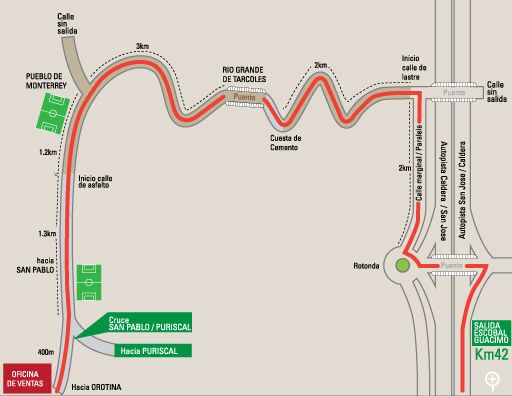 Take the highway San José-Caldera and exit at km 42, pass over the highway and arrive at a roundabout, take the marginal Street from East to West for 2 kms until you reach a “T”. Bear left for 2 kilometers downhill until you reach a bridge. After the bridge follow the road for 3 km until you reach the Village of Monterey (The sports plaza on the right). Continue 2.5 kilometers until you reach the Town of San Pablo of Turrubares. From the plaza at San Pablo de Turrubares, continue 400 mts without deviating and the office of MBC Grupo Inmobiliario will be at your left.